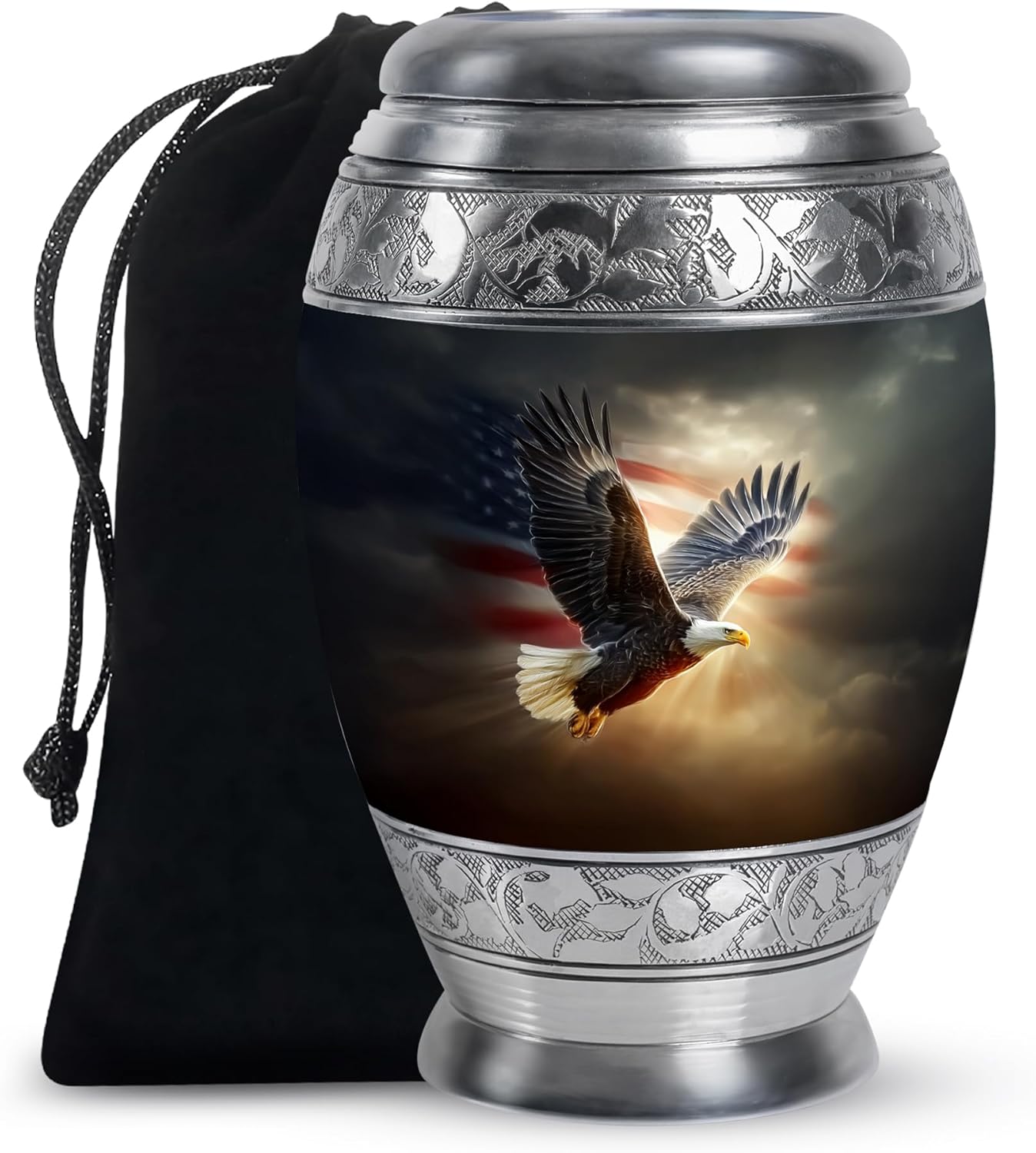 This beautiful looking 10-inch urns for human ashes adult female and male features a flying eagle design, symbolizing strength, freedom, and a peaceful journey to the afterlife. Crafted with care and attention to detail, the urn for ashes adult female and male is made from durable materials and finished with a smooth, good-quality surface. With a generous capacity of 200 cubic inches, it is suitable to hold the ashes of an adult weighing up to 200 lbs. The cremation urns for men and women is equipped with a secure screw-top lid to ensure the ashes remain safely enclosed. A soft velvet bag is also included to protect the urn from dust and scratches, preserving its beauty for years to come. This human urns for ashes is not only a beautiful tribute but also a lasting memorial that honors your loved one with dignity and grace. Perfect for home display or burial, this flying eagle urn ashes holder captures the spirit of strength and remembrance in a timeless design.
